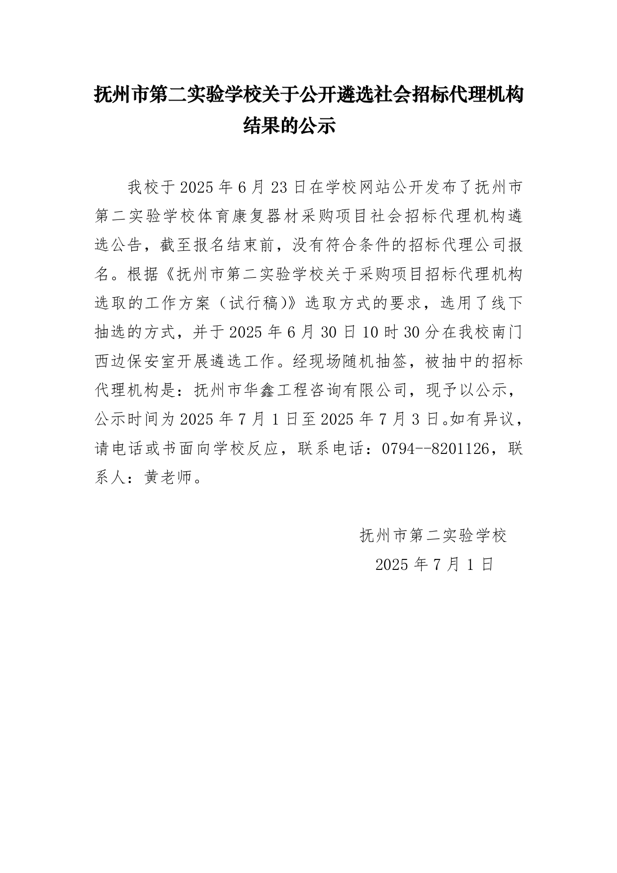 我校于 2025 年 6 月 23 日在学校网站公开发布了抚州市第二实验学校体育康复器材采购项目社会招标代理机构遴选公告,截至报名结束前,没有符合条件的招标代理公司报名。根据《抚州市第二实验学校关于采购项目招标代理机构选取的工作方案(试行稿)》选取方式的要求,选用了线下抽选的方式,并于 2025 年 6 月30 日10 时30 分在我校南门西边保安室开展遴选工作。经现场随机抽签,被抽中的招标代理机构是:抚州市华鑫工程咨询有限公司,现予以公示,公示时间为 2025 年 7 月 1 日至2025 年7 月3 日。如有异议,请电话或书面向学校反应,联系电话:0794--8201126,联系人:黄老师。